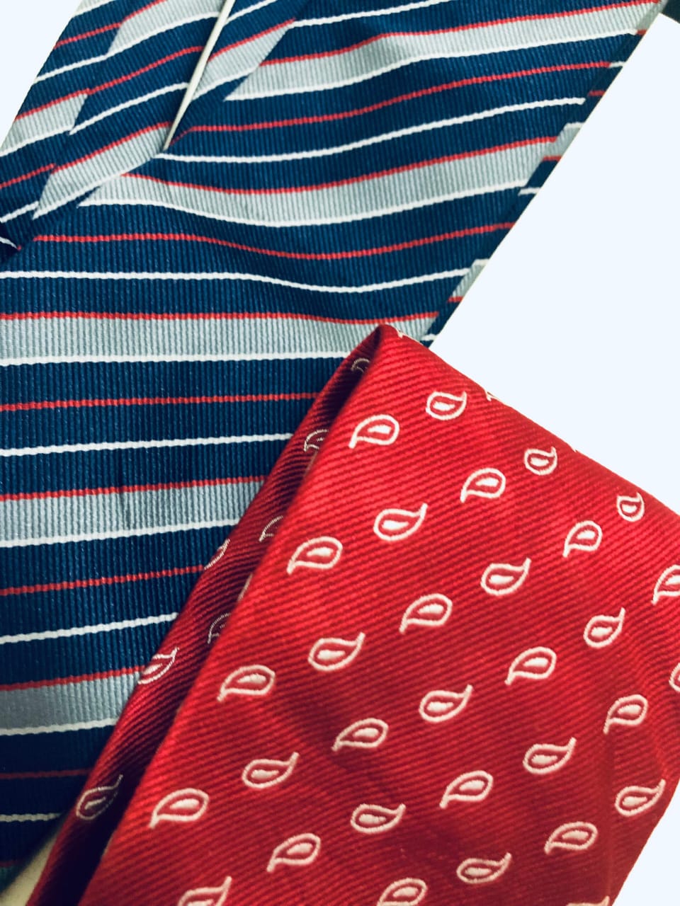 Set of two contrasting ties. Blue lined tie with red paislays patterned tie.