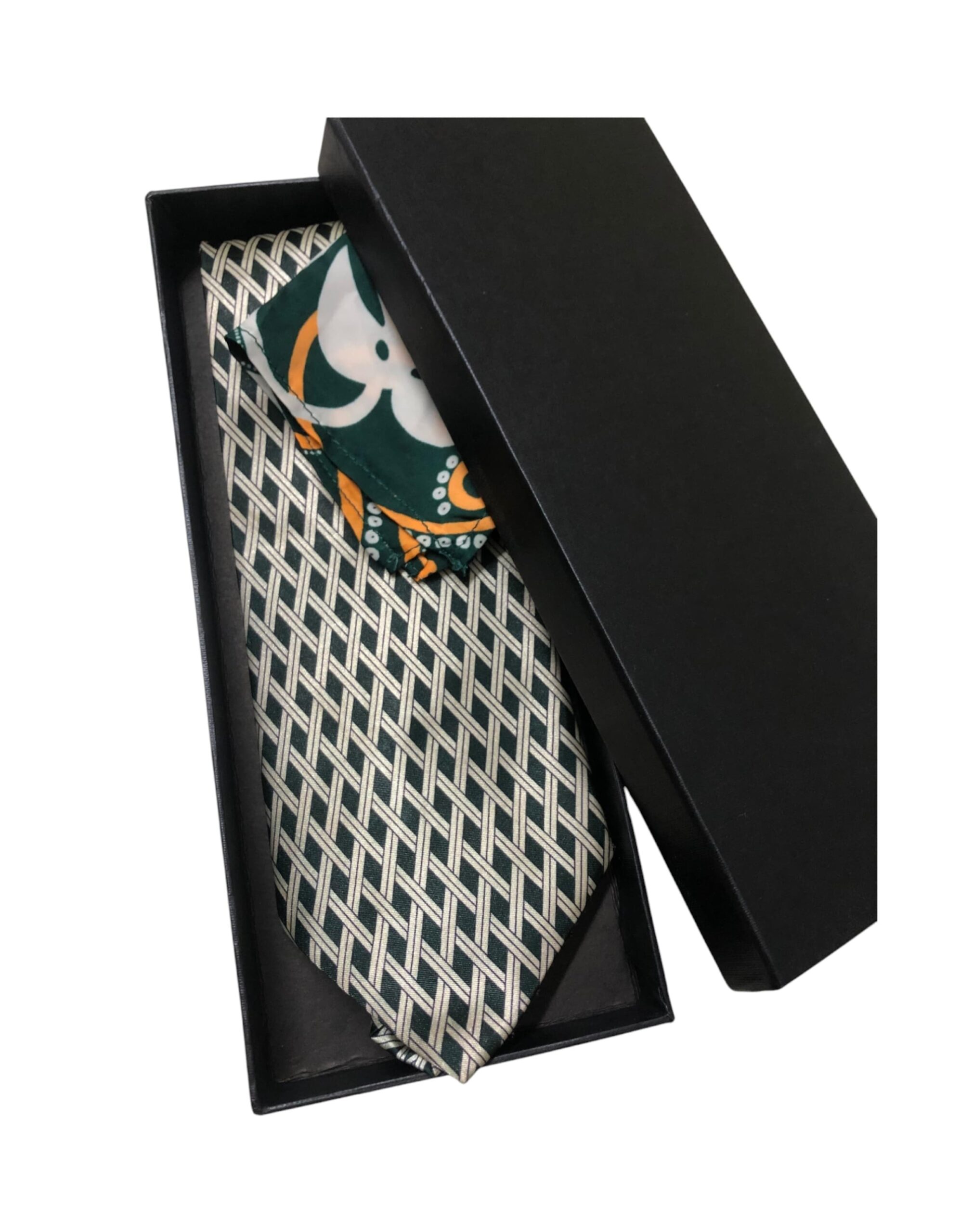 Set of patterned tie with contrasting pocket square.