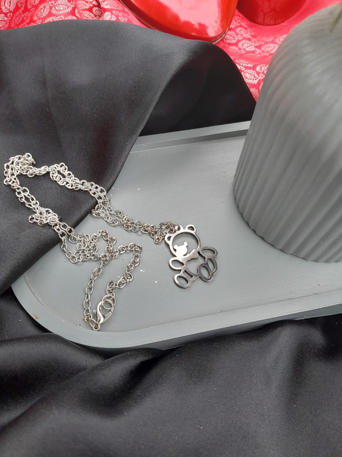 2D metallic silver colored pendant with chain.